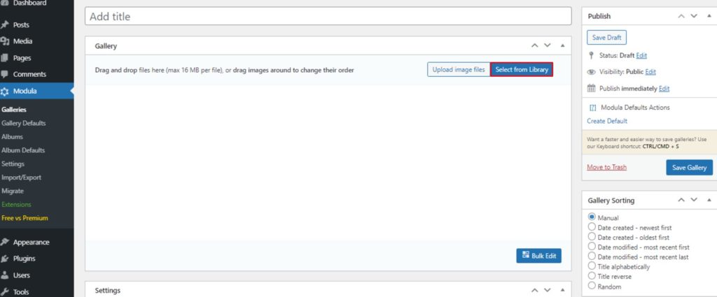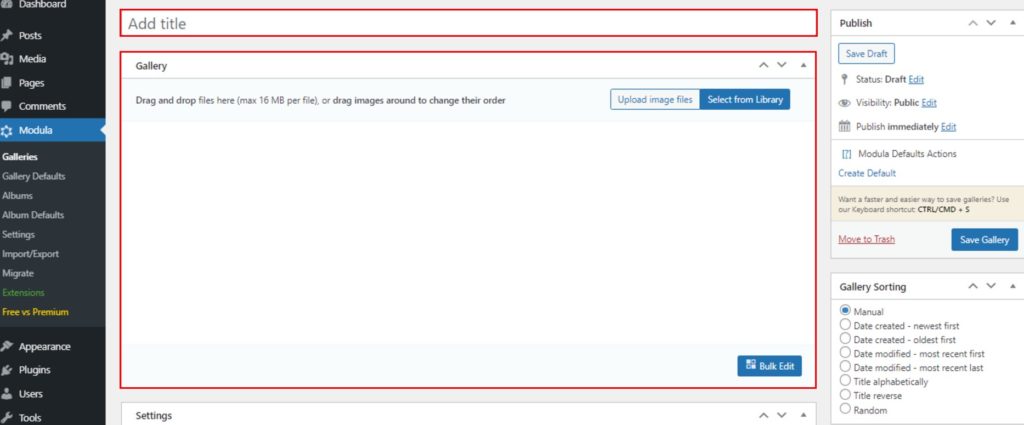 Now that we have our plugin installed, we need to create a new gallery. Go to Modula > Galleries > Add New. Every time you are looking to create a new gallery, follow the next steps.