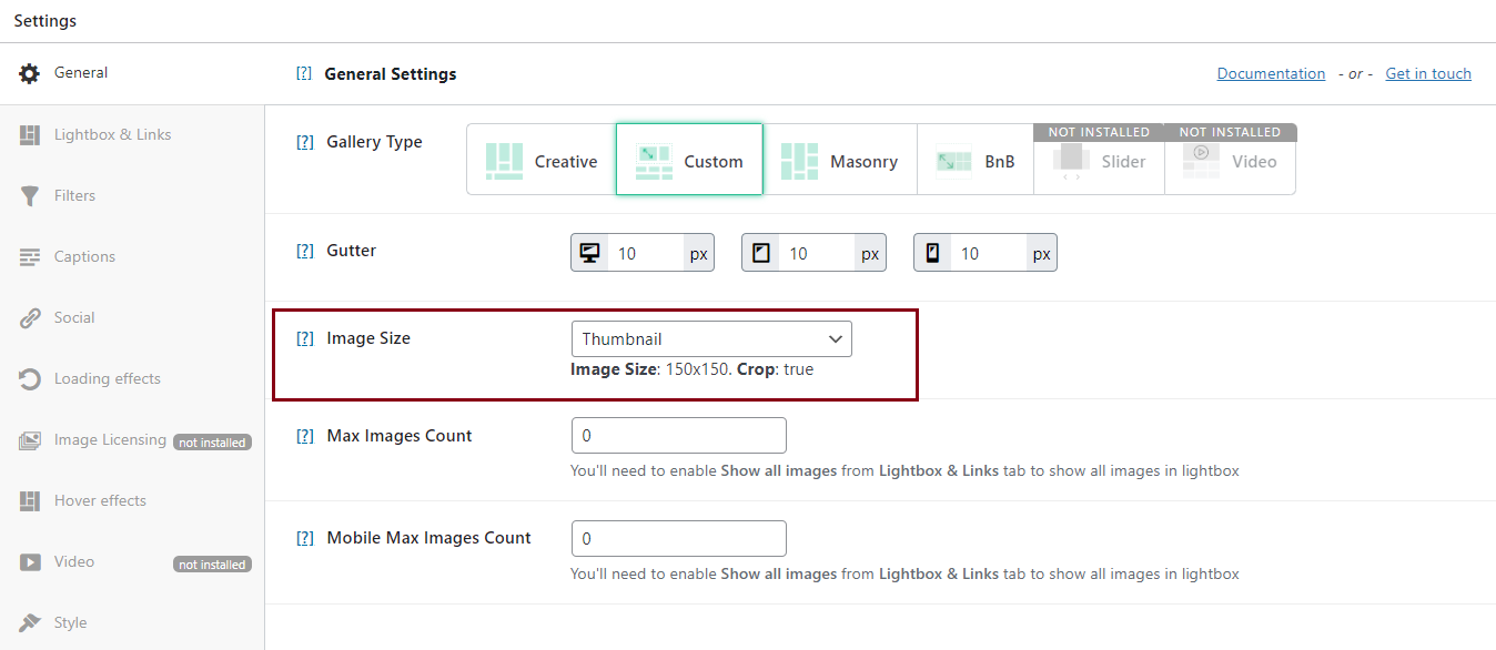 Scroll down and go to General Settings. In the gallery type, you can add a gallery with custom grids, a gallery with columns, a slider, or a creative gallery.