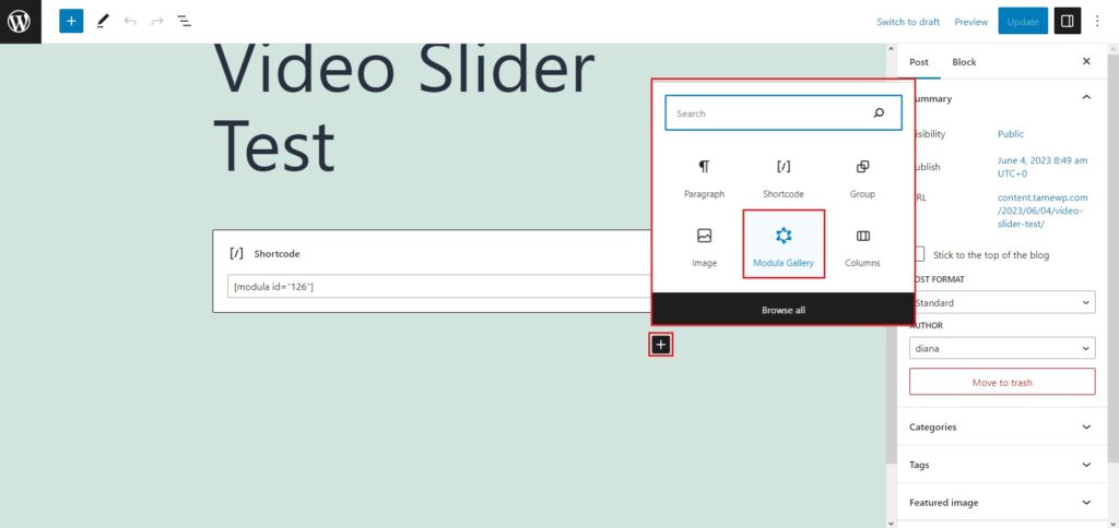 Navigate to the page or post where you’re eager to showcase your video slider gallery. You can paste the shortcode directly into the page editor or click the “+ “icon and search for the Modula Gallery widget.