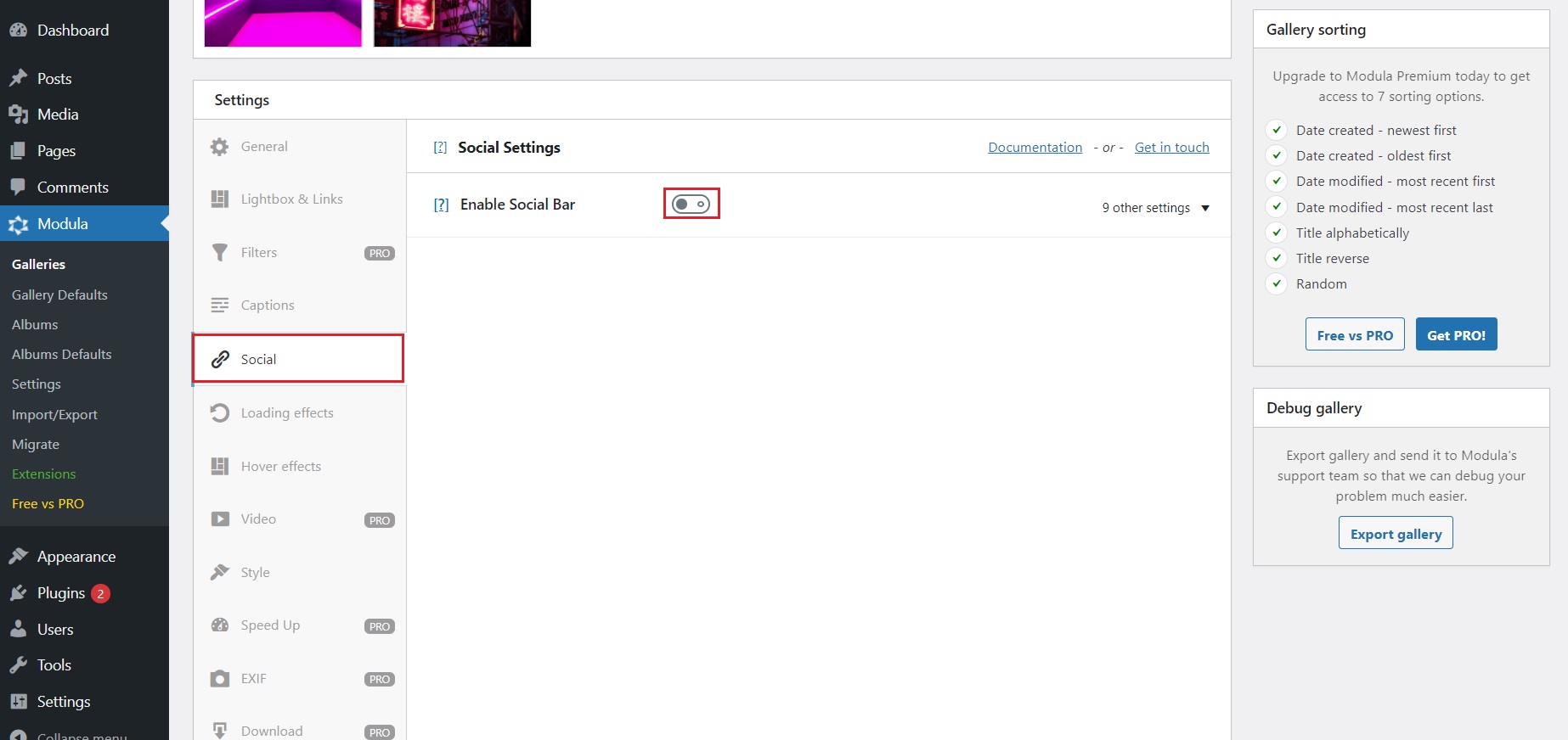 In your Modula gallery settings, locate the “Social” tab. From there, turn on the Enable social sharing button.