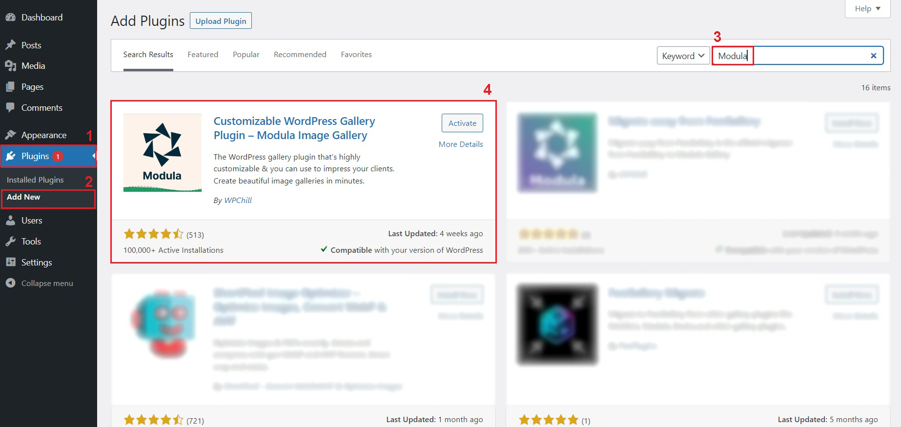 In the search bar, type Modula. Locate the plugin developed by WPChill. Click on the Install Now button. Once it is finished installing, click on the activate button.