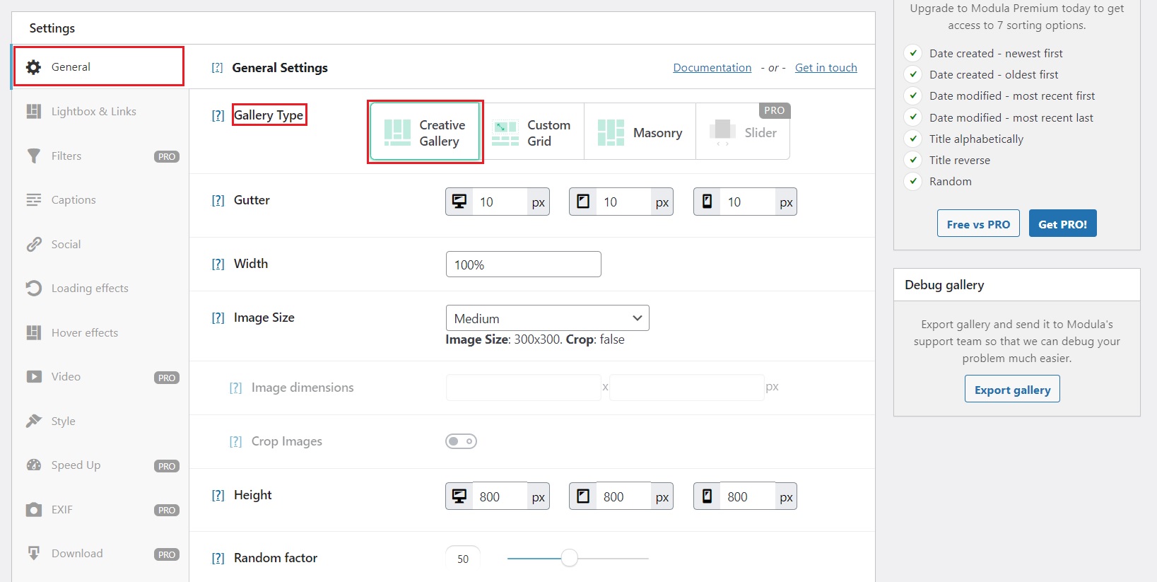If you scroll down to the Settings section under the General Tab, let’s pick the Creative Gallery type.