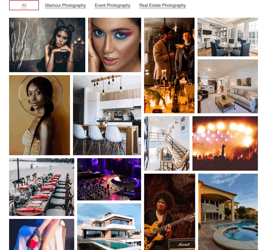 At the beginning of the page, a default filter will appear. The default filter is All so that all visitors can see all images. After clicking on a filter, the selected option will load