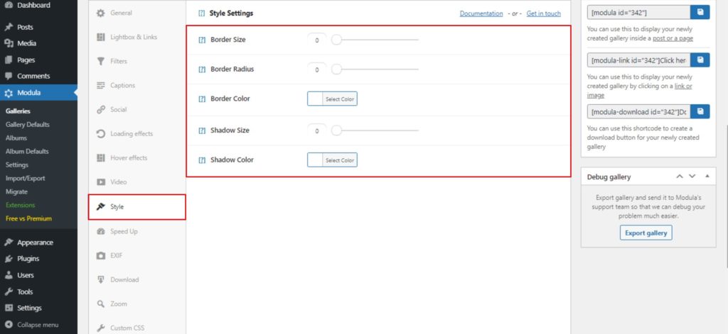 Maybe you want to add a little border to your images. To do that, go to the Style section. Here you can dit the border size, border radius, border color, shadow size, shadow color.