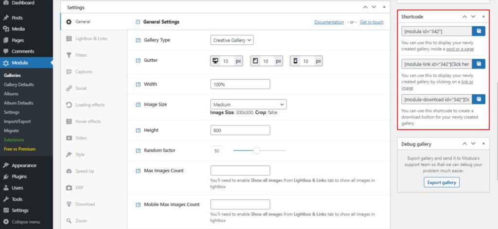 Now, let’s see more editing for our entire gallery. Go to General > Gallery Type and choose from four different gallery types. Here you can edit the image size, height, width, gutter, and so much more. I chose to go with the creative gallery.