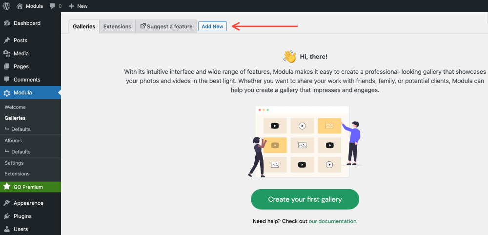 On the next page, look for the Add New button at the top or click the Create your first gallery option, especially if this is your first time creating image galleries using Modula.