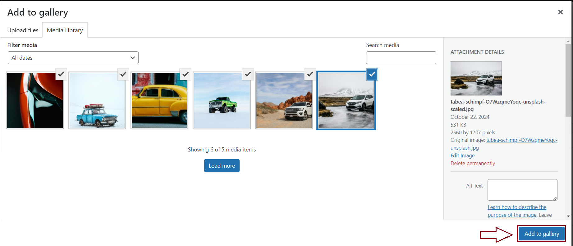 You will then be able to add those images to your gallery as shown below: