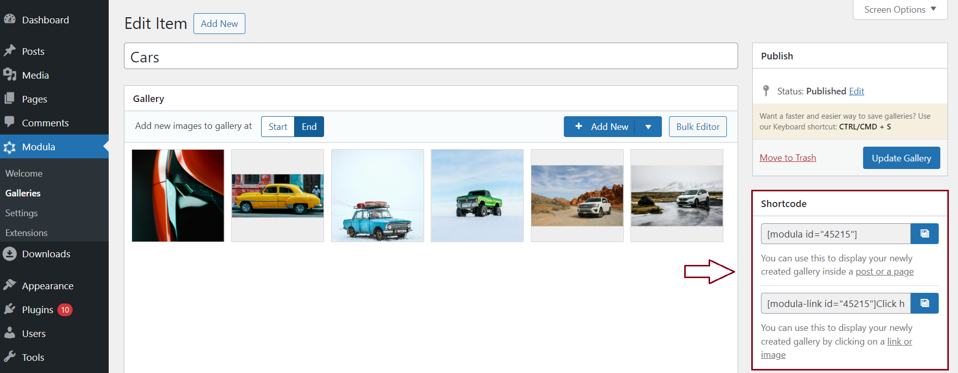 Once you’ve published your gallery, you’ll notice the gallery shortcode appeared in the gallery edit area as shown below…