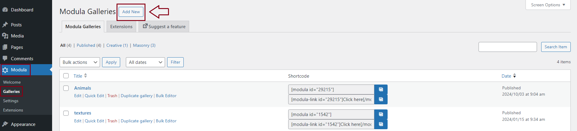 Once Modula is both installed and activated hover over the Modula WordPress Admin menu item and click Add New to create your first gallery in WordPress…