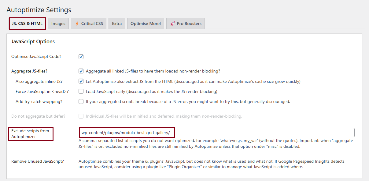 In rare cases, Autoptimize and Modula may not function seamlessly together by default. If you encounter issues, follow these additional steps to ensure proper configuration for Autoptimize.