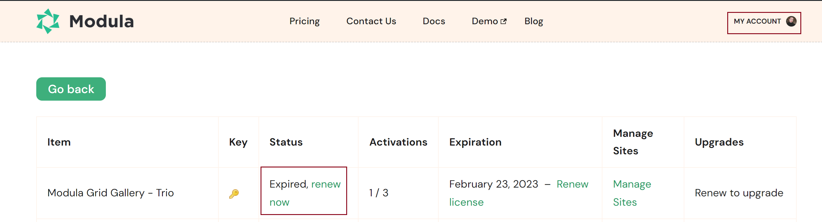 -> Next to your license key, you will see ‘Expired.’ Click on ‘renew now.‘
