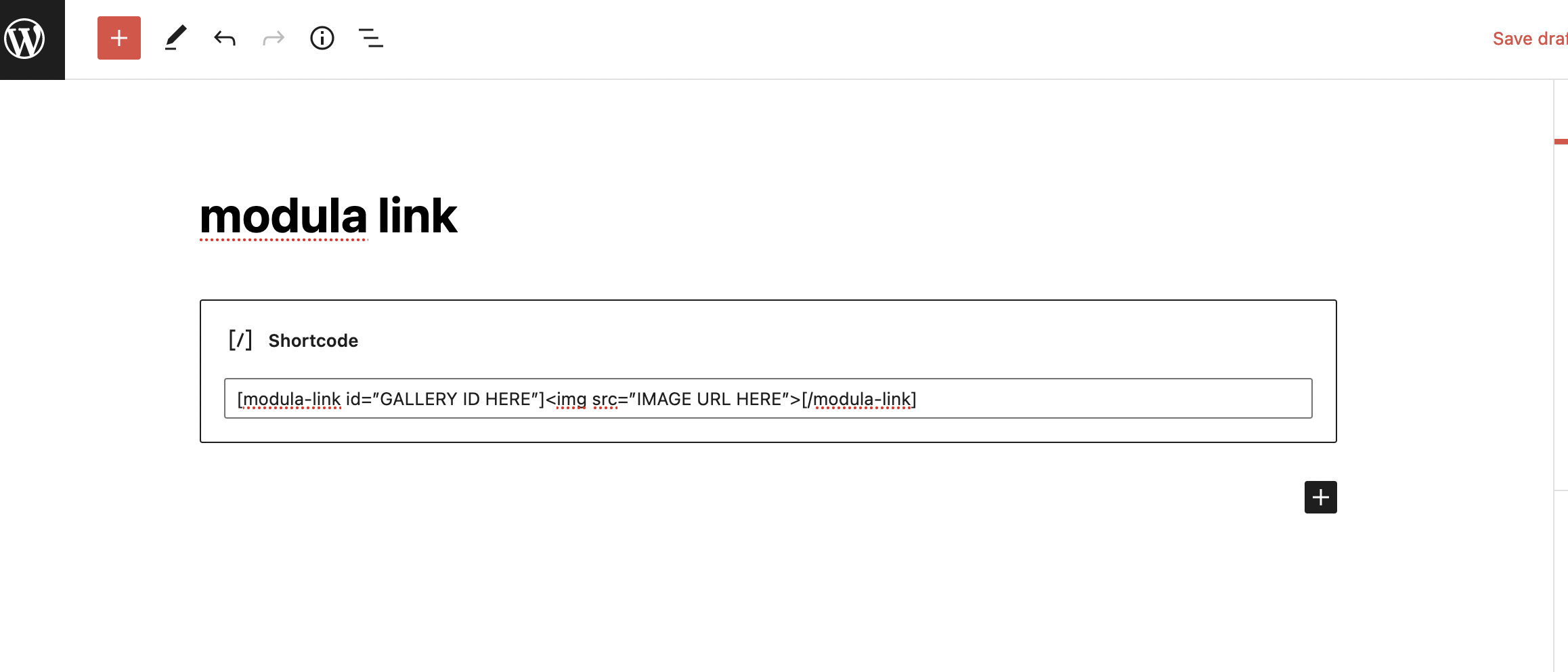 -> Paste the Shortcode: Insert the following shortcode within the block:[modula-link id="GALLERY_ID_HERE"]<img src="IMAGE_URL_HERE">[/modula-link]Replace “GALLERY_ID_HERE” with the actual ID of your Modula gallery.