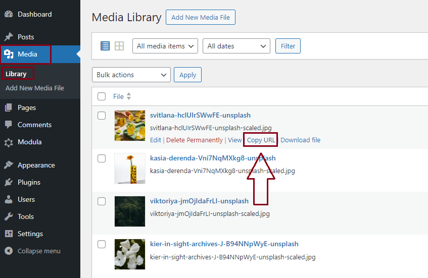 -> Get Image URL: Visit your WordPress dashboard > Navigate to “Media Library.” > Hover over the desired image, and copy its URL.