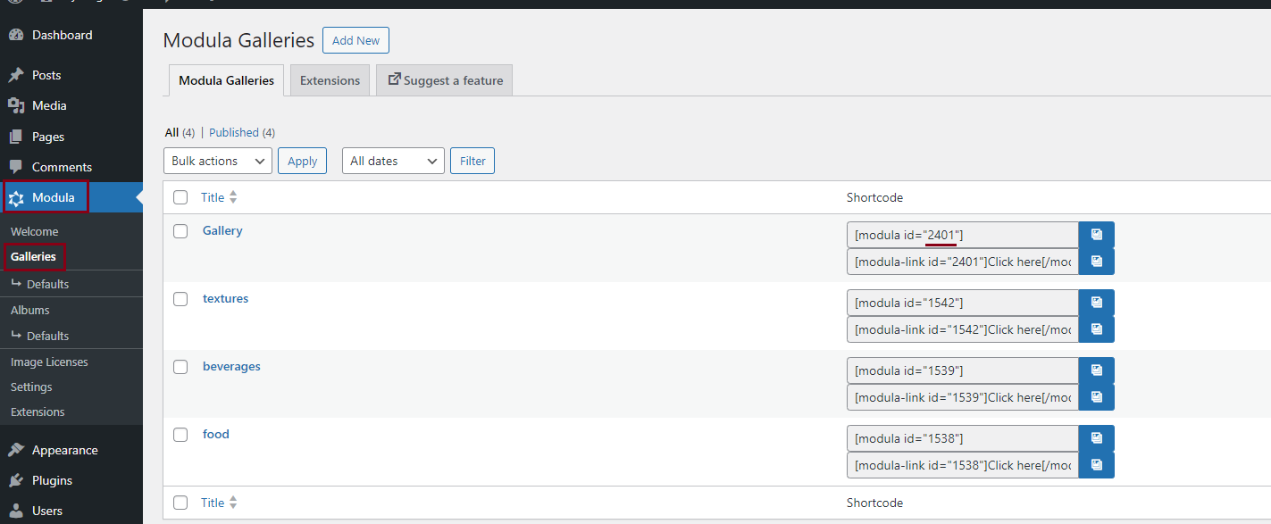 -> Get Gallery ID: Go to your WordPress dashboard > Navigate to “Modula” and select “Galleries.” > Find the gallery you want and note its ID.