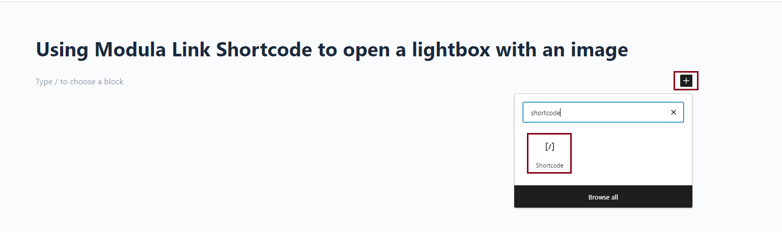 -> Select the Shortcode Block: Within the Gutenberg editor, click the ‘+’ button to add a new block > from the block list select the ‘shortcode‘ block to insert the Modula Link shortcode.