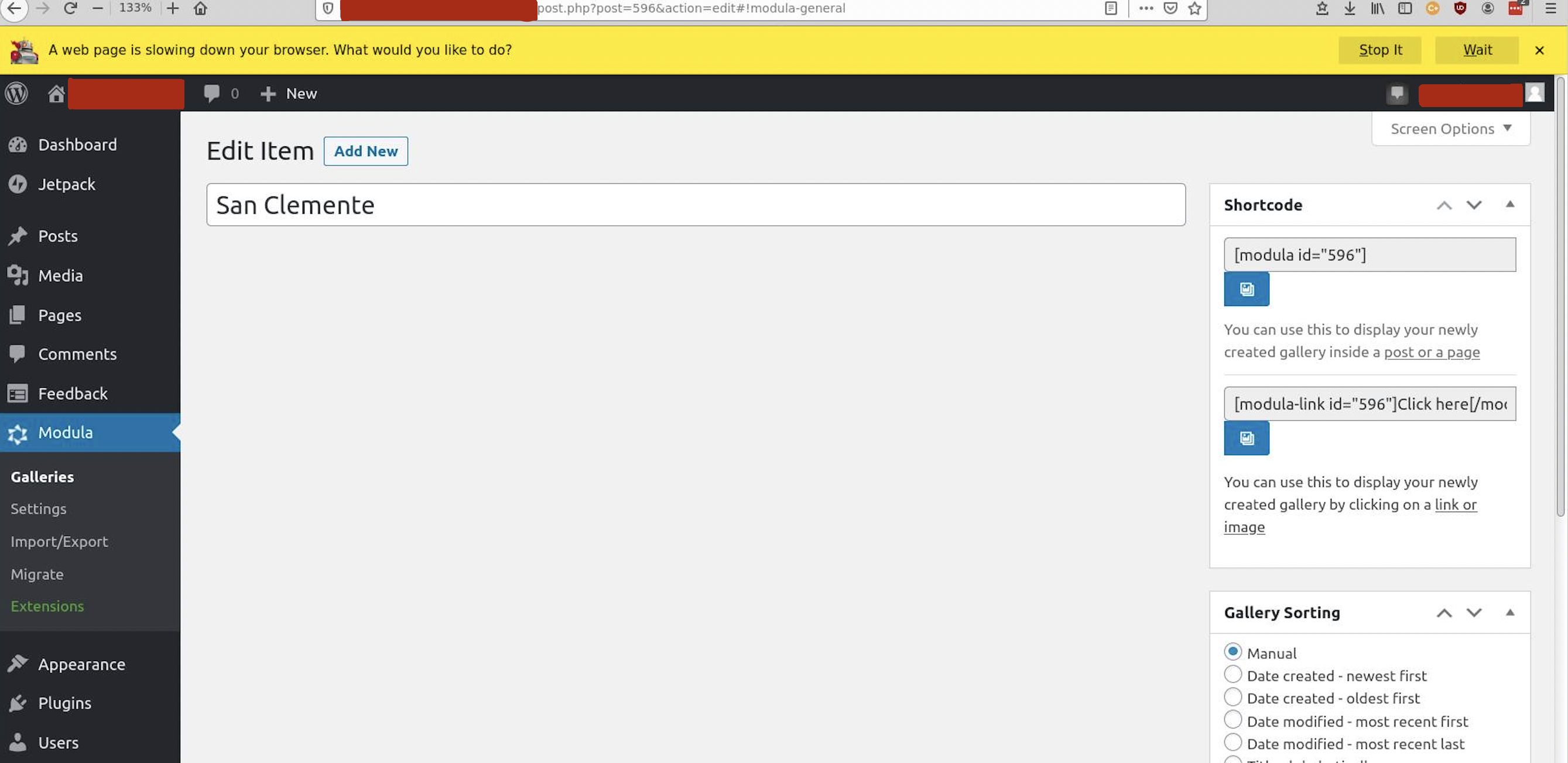 Although it’s an uncommon issue and happens randomly, sometimes when trying to edit your galleries your browser will freeze and you may get a yellow bar in the browser window saying a script is slowing down the page – like in the screenshot below.