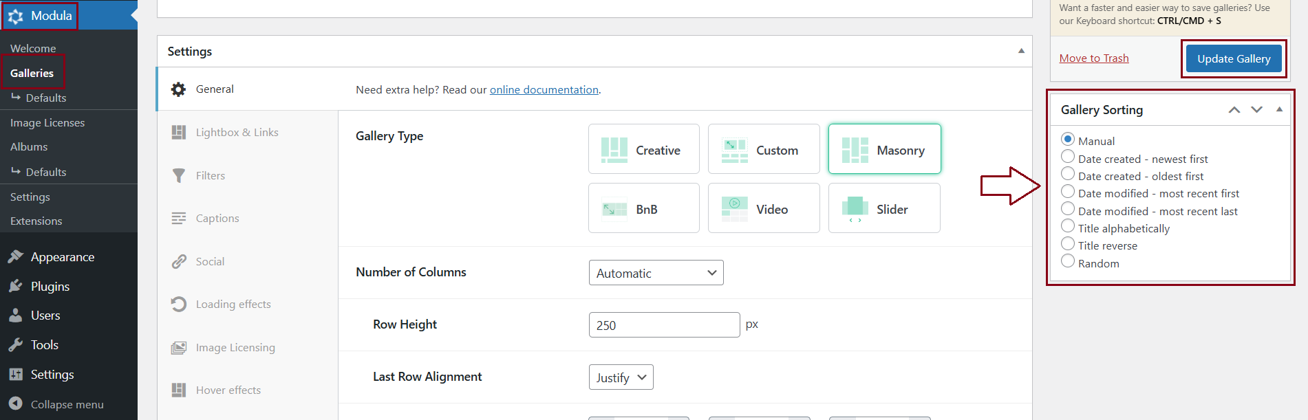 With Modula Pro, we’ve introduced the “Gallery Sorting” option, which gives you full control over how your images are arranged. Whether you want to sort by the date the image was added, the date it was modified, or even alphabetically by title, we’ve got you covered.