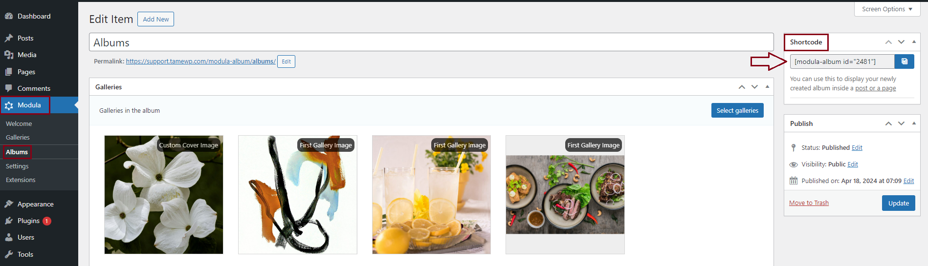 The process is the same to locate the album’s ID. When you’re editing your Modula Album, you’ll encounter the same shortcode panel displaying the unique ID number for easy reference.