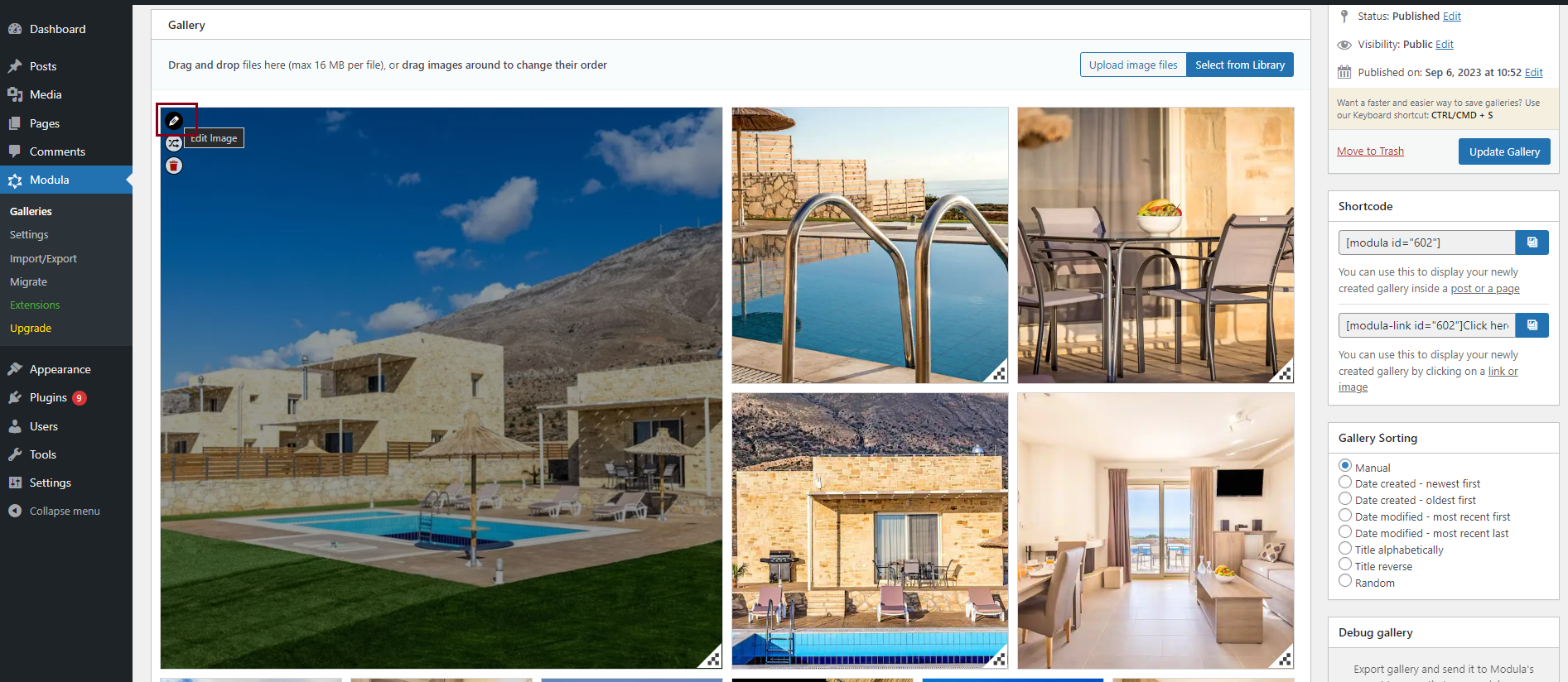 The last thing we need to do is to link these two galleries we created. Go to your dashboard > Modula > Galleries and select the first gallery you created. Click on the pencil icon of the first image to edit it.