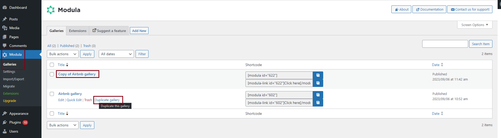 To achieve this with our plugin you need to go to your WordPress dashboard > Modula > Galleries > click on Duplicate gallery on the gallery you created above. A new one will be displayed in your dashboard and we can edit that one how we like.