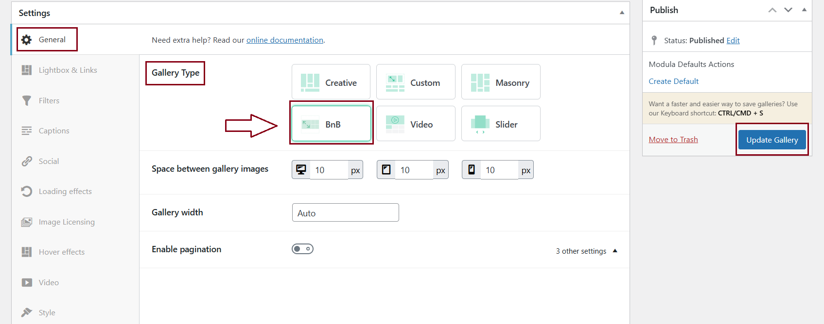 Go to your WordPress dashboard > Modula > Galleries > Edit your gallery or create a new one > General Settings > Gallery type > Select the ‘BnB‘ gallery type > Update gallery.
