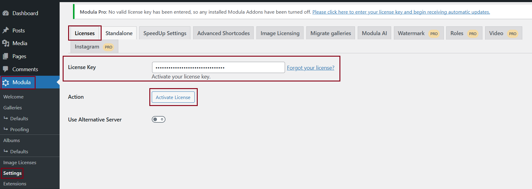 To activate your license key, go to Modula > Setting > Licenses and paste your license key. Click on the Activate License button to activate it. For more info please follow the tutorial here.