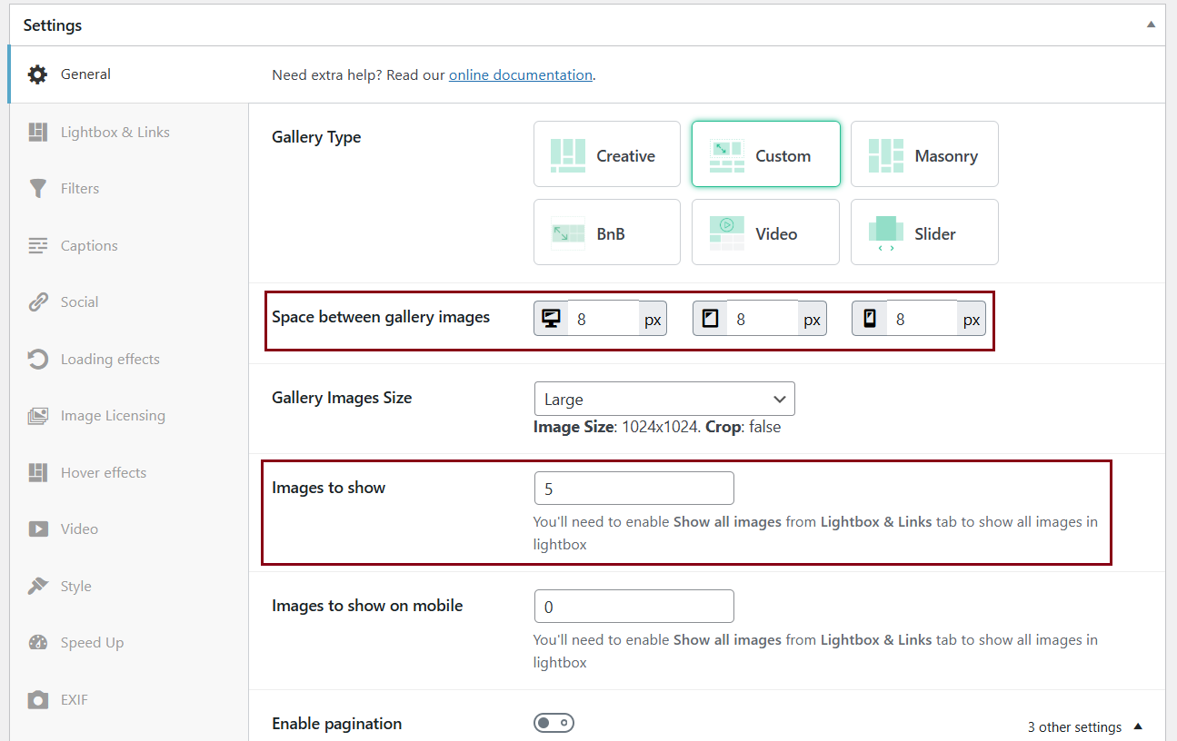 What you need to do after this is set the spacing between the images to be like on Airbnb. To achieve this, go to the General Settings tab > Space between gallery images > lower the value to 8 px.