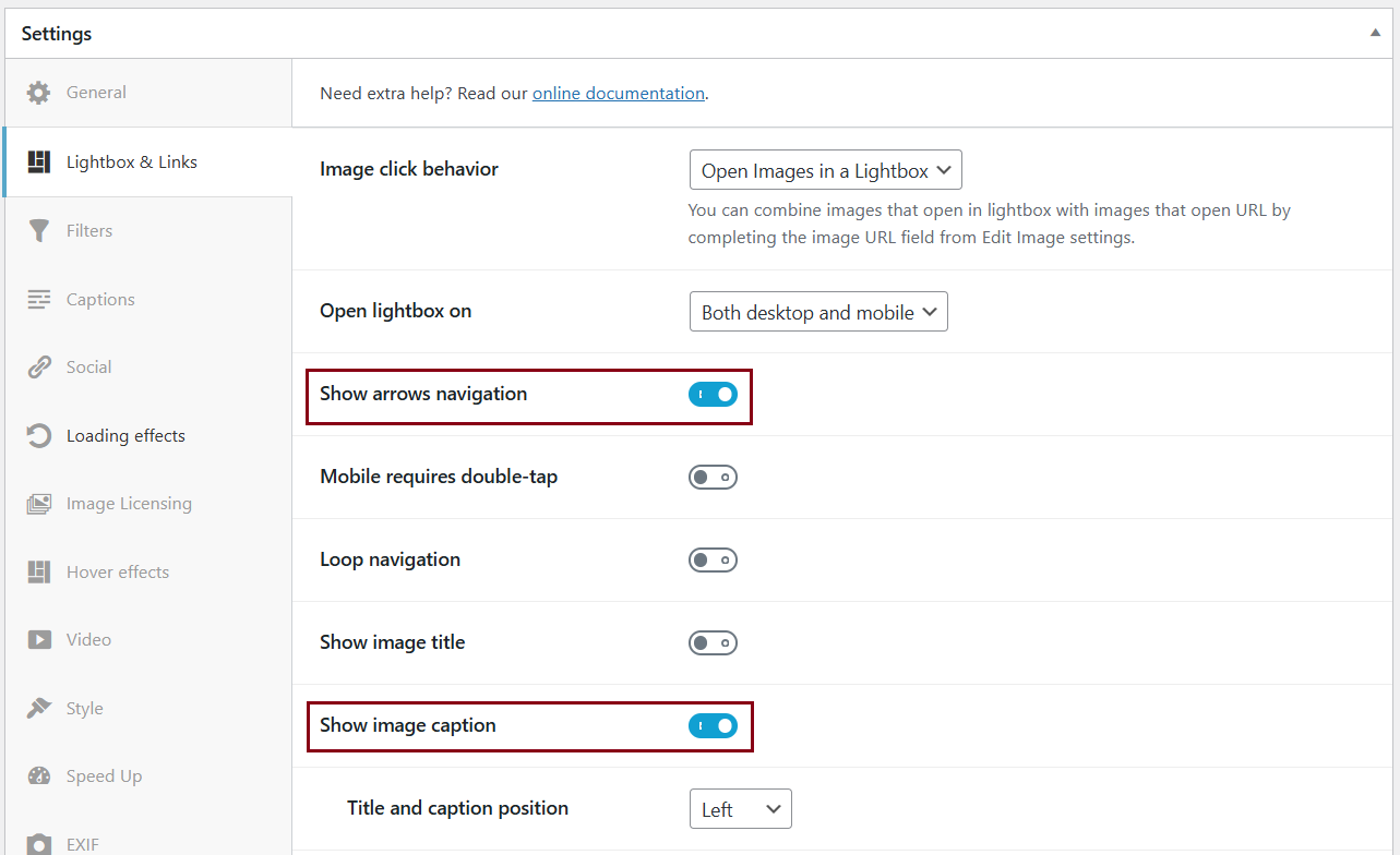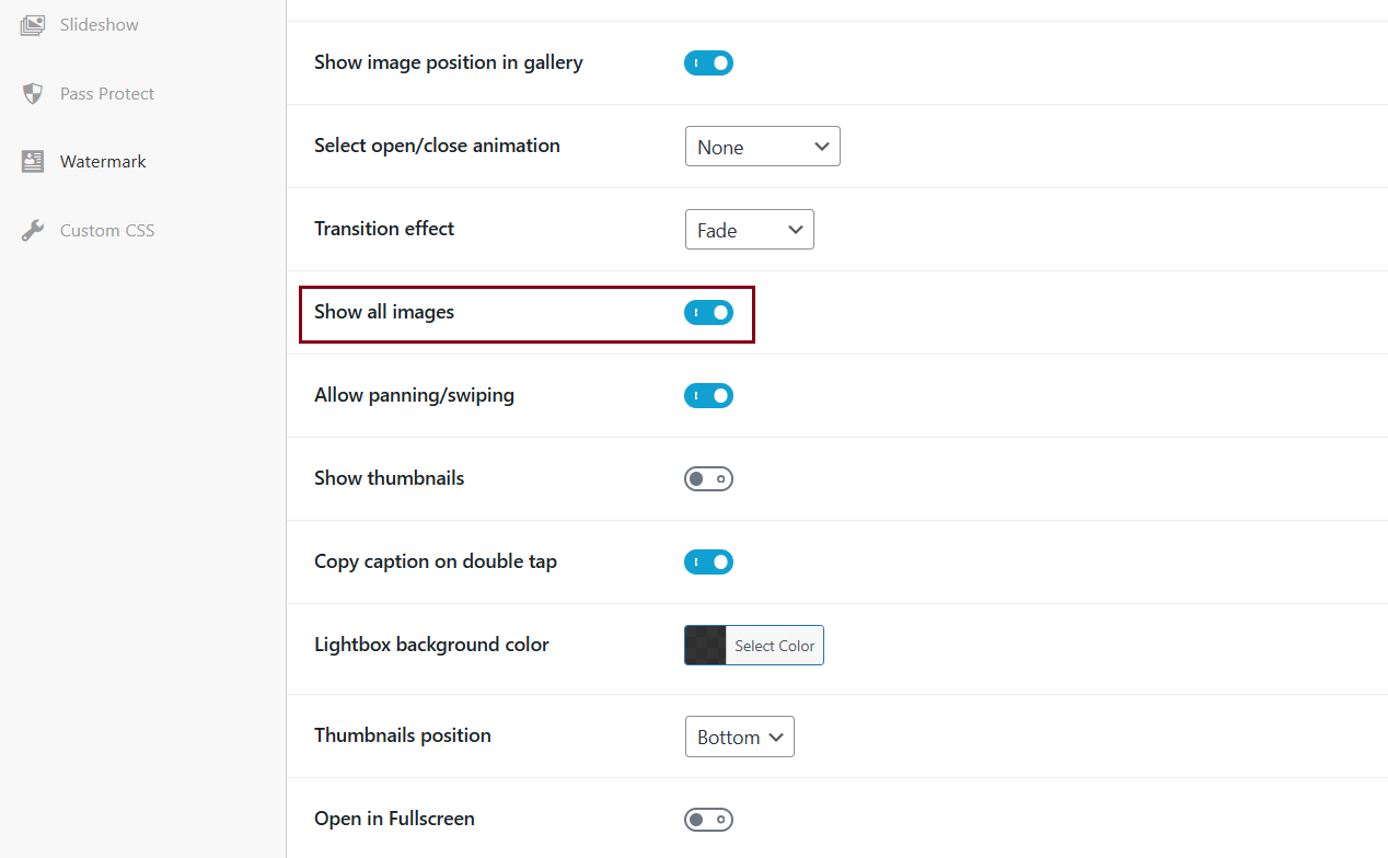 Now, we need to make sure that all of the images are displayed in the lightbox. To do so go to the Lightbox & Links tab and enable the Show All Images feature.