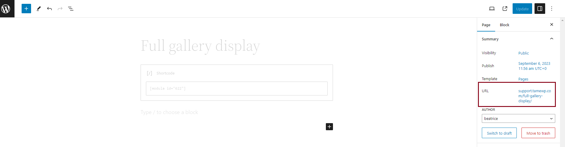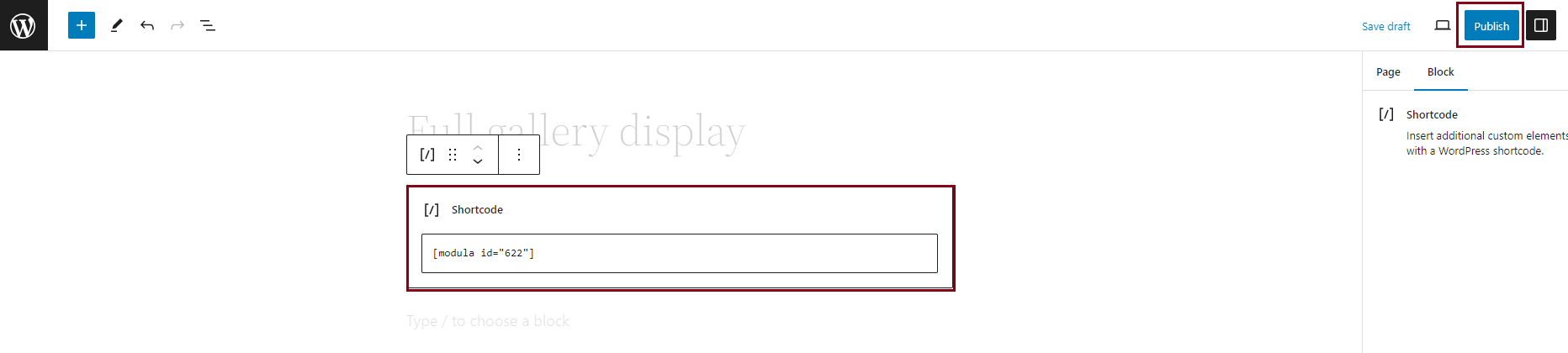 Go to your WordPress dashboard > Pages > Add new. This will be the page that displays the image gallery in full. Set a title and paste the shortcode of the duplicated gallery in the Shortcode block.