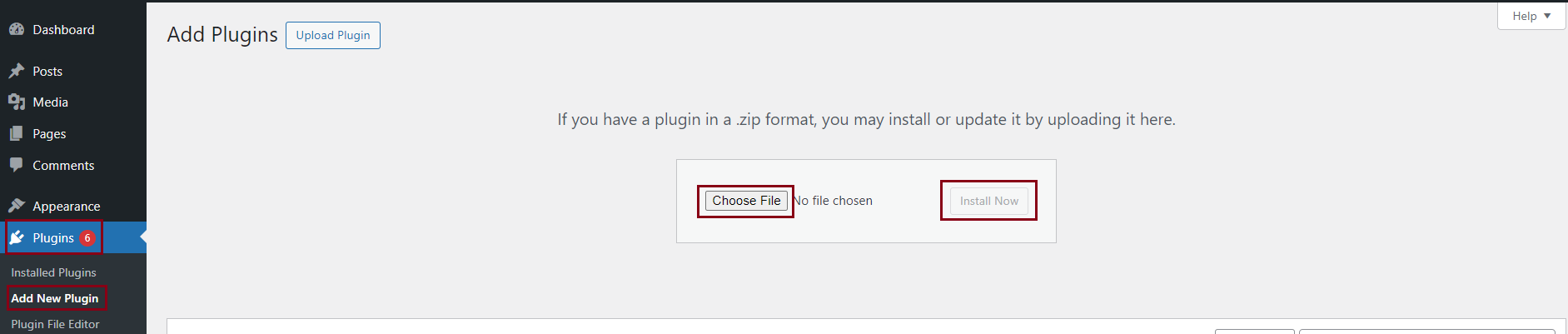 Now go to your WordPress Dashboard > Plugins > Add New > Upload plugin > Choose file > Install Now.