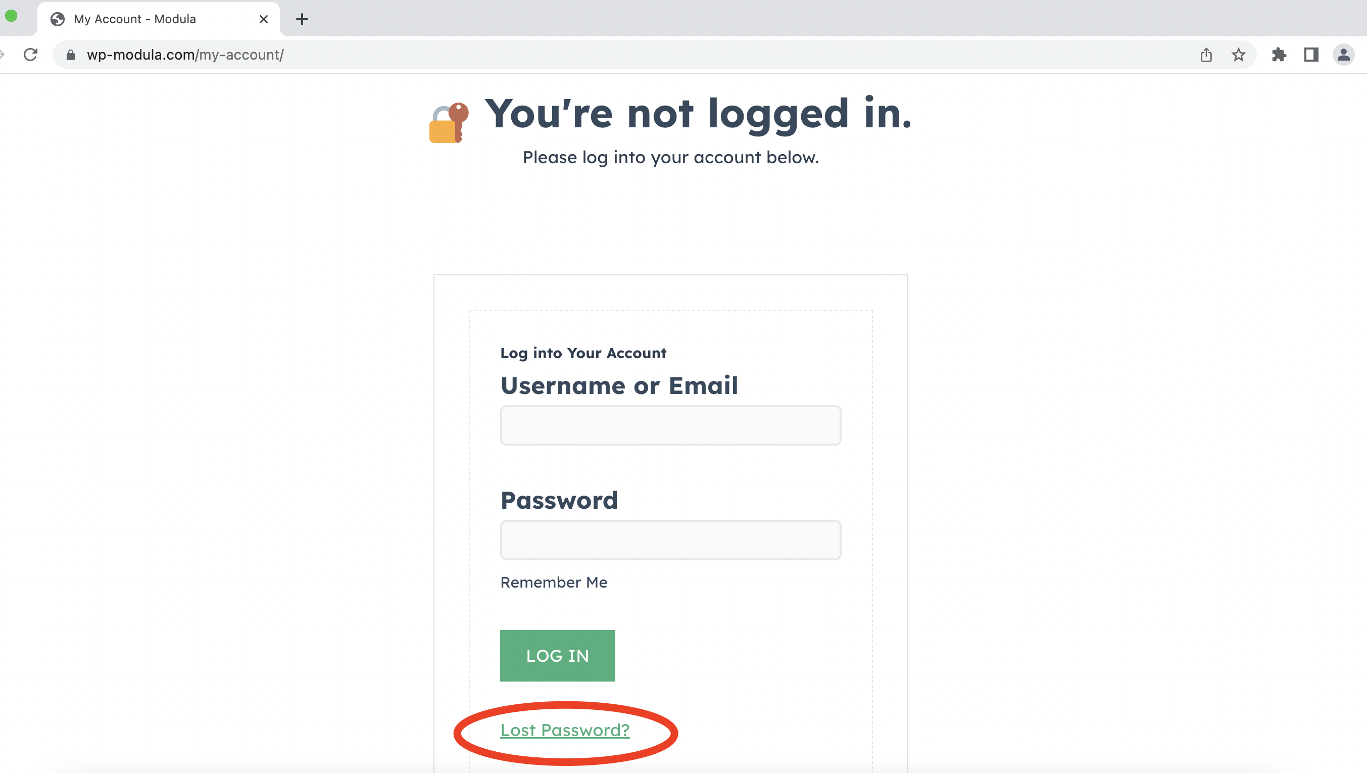 -> Clicking “Lost Password” will redirect you to a password reset form. Here, you’ll need to provide the email address you used when purchasing Modula.