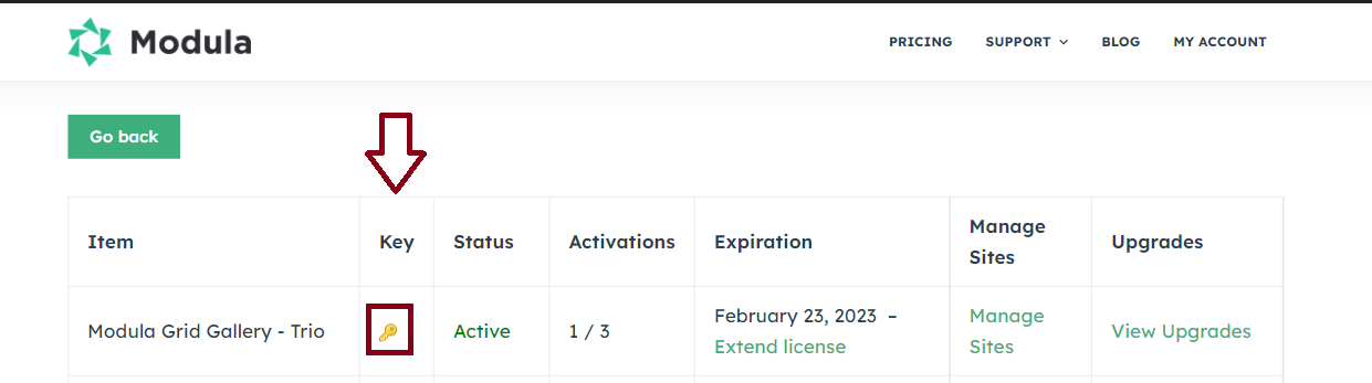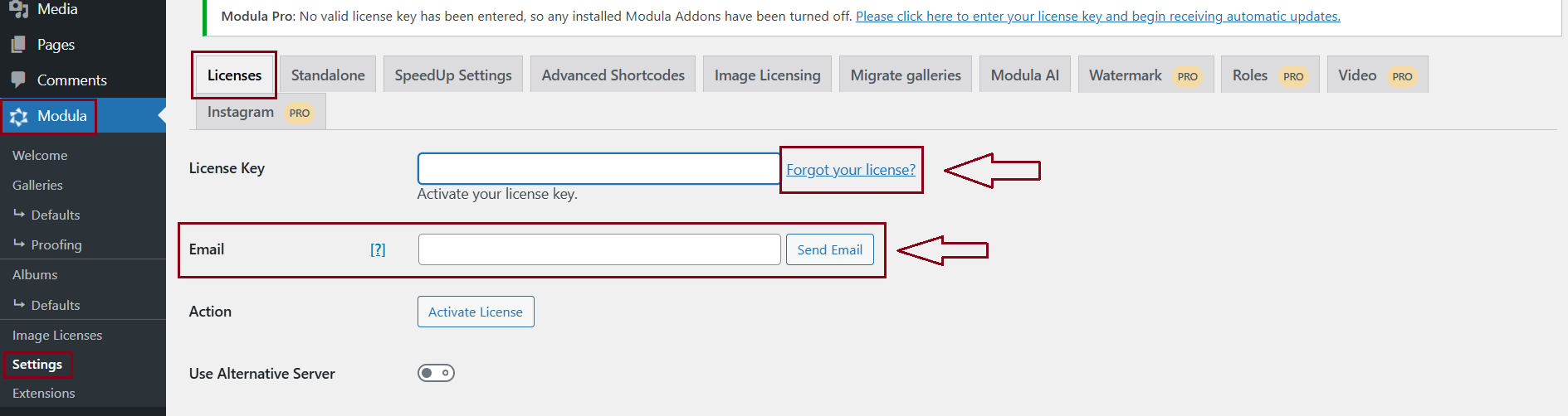 Go to your WordPress dashboard > Modula > Settings > Licenses > click on the ‘Forgot your license?‘ link > Email > Enter the email address used for license acquisition > click on ‘Send Email‘.