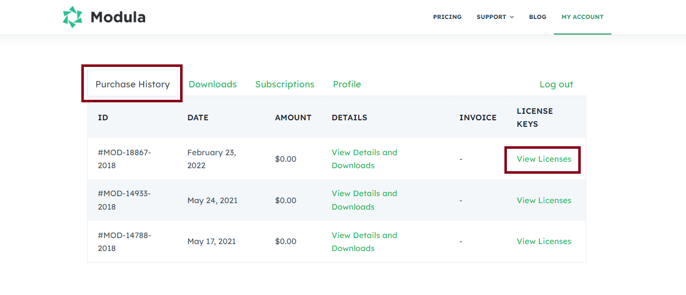Go to Purchase History > License Keys > View licenses.