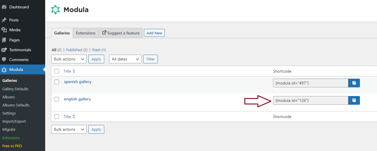 Add your Modula gallery on the main language pages