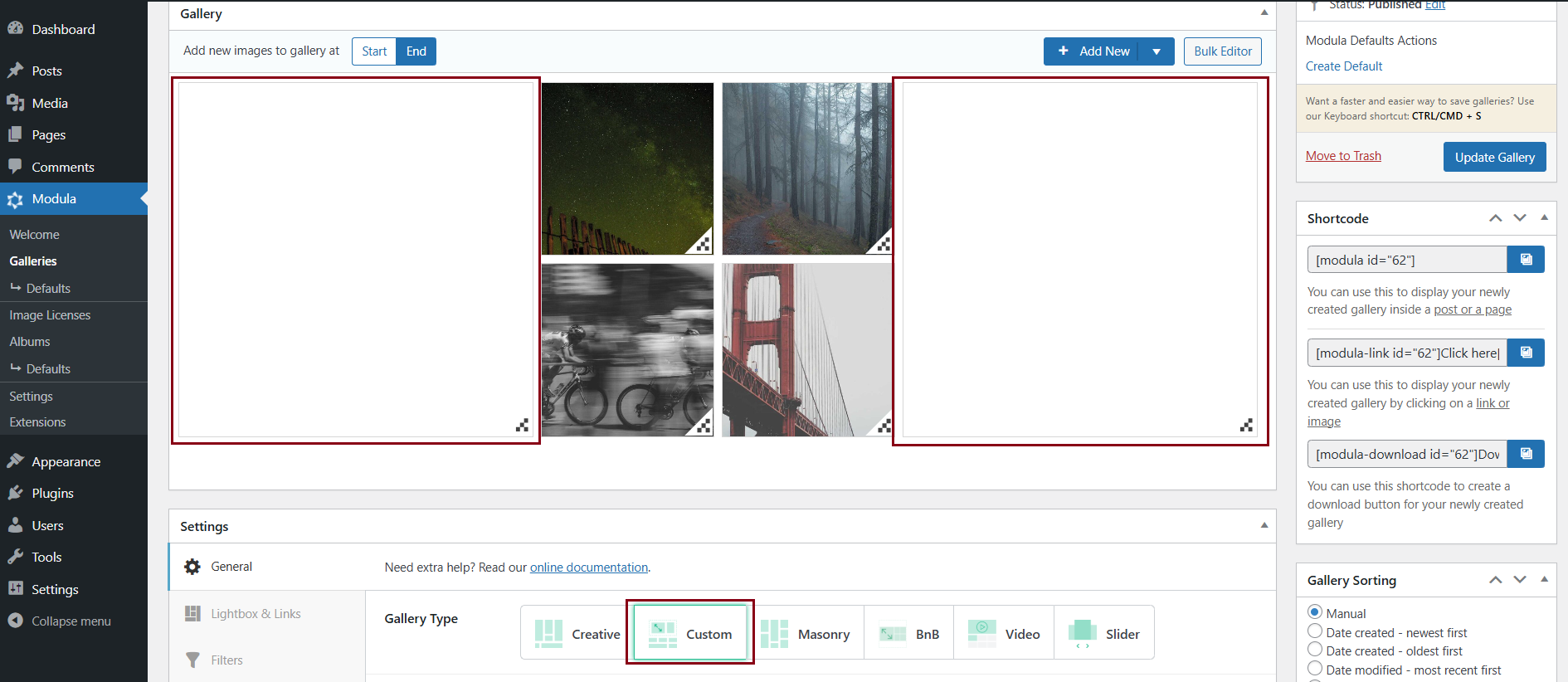 Modula’s Custom Grid gallery type offers you the flexibility to reshape and resize images within your gallery’s container, giving you control over their dimensions and aspect ratios. This versatile feature allows you to craft diverse layouts, whether you need a masonry-style arrangement or columns and rows.