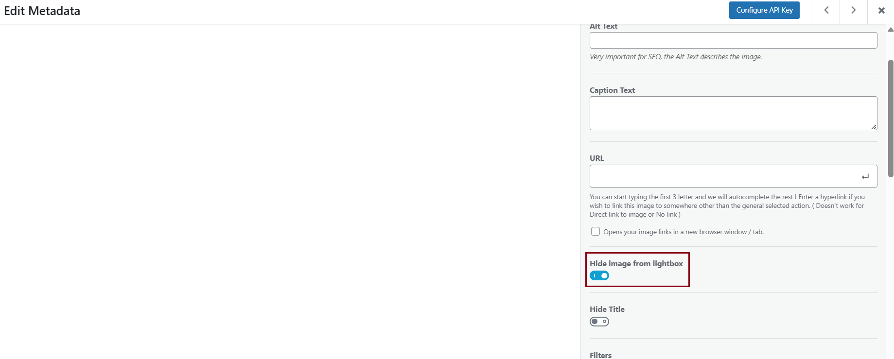 Note: Keep in mind that any images added to the gallery will also appear in the lightbox, which may not be desired.