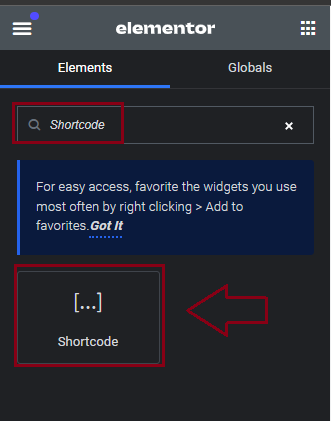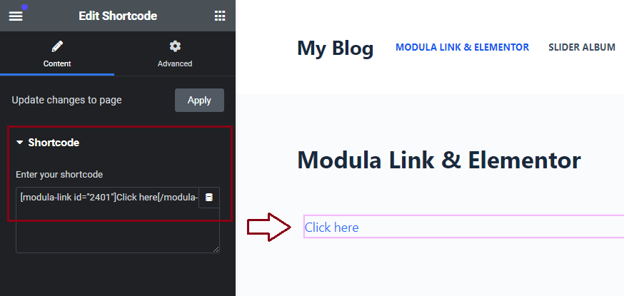 Search for the Elementor shortcode widget and paste the Modula Link shortcode you copied earlier into it.
