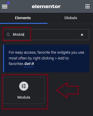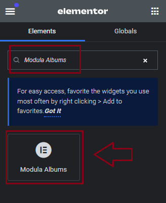 Search for the Modula Albums widget in Elementor and add it to your page.