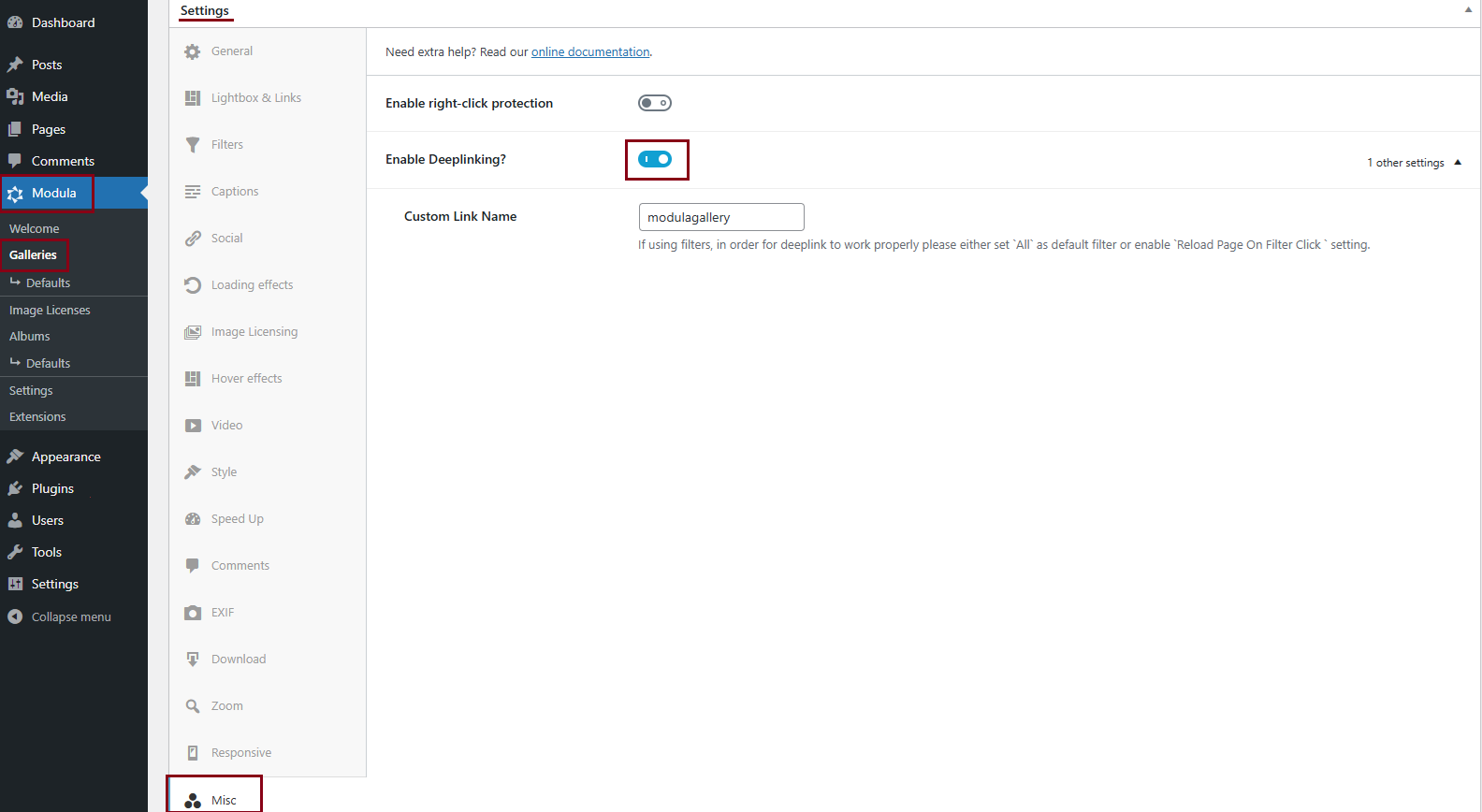 -> Specify a custom prefix for your images’ URL in the “Custom Link Name” field. This prefix will be used to link to images and open them in the lightbox. The default is modulagallery. - Save Changes