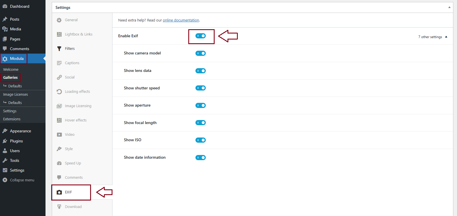 Access your WordPress dashboard > Modula > Galleries > Choose your gallery > EXIF label > Enable EXIF.