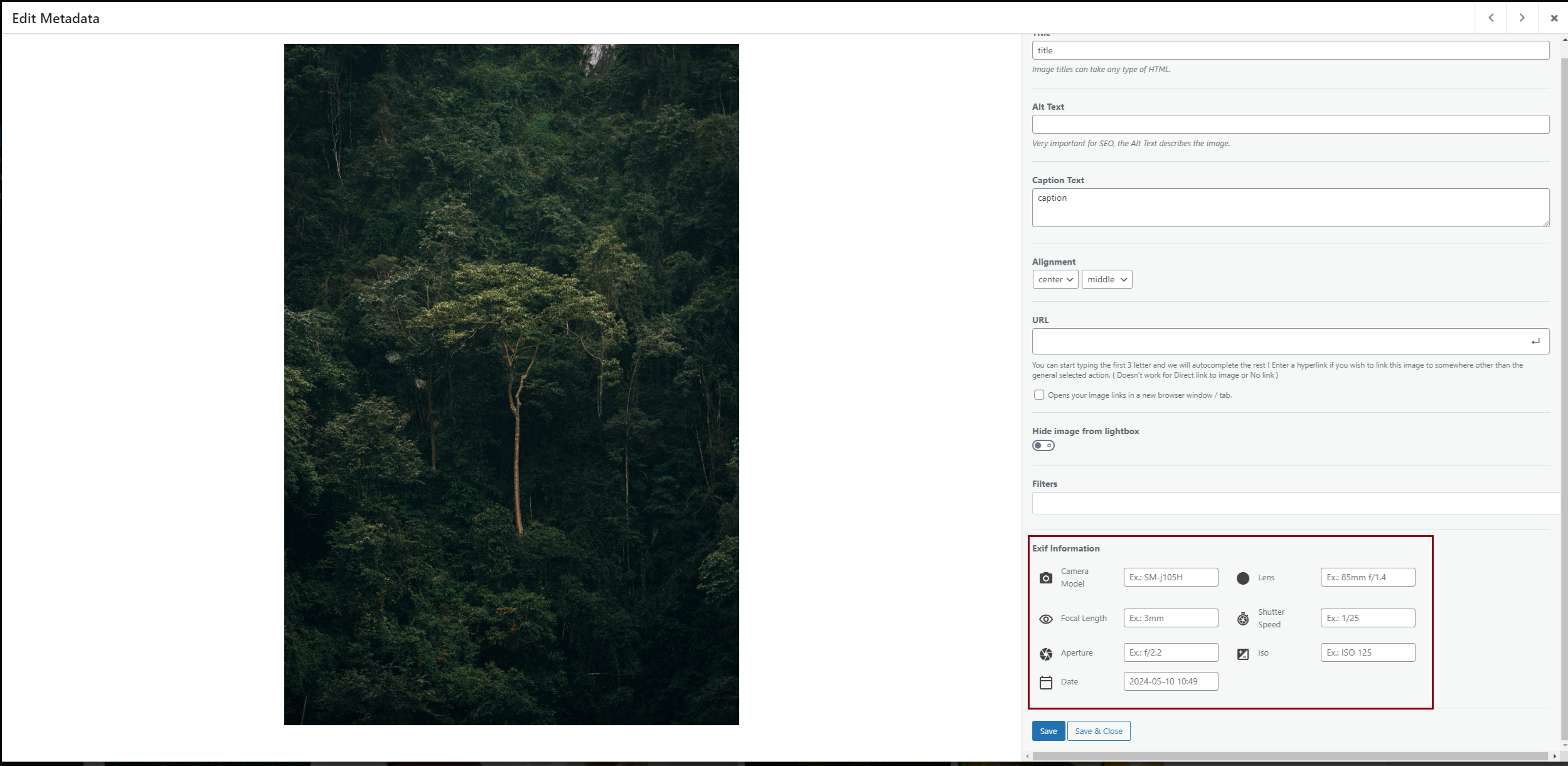 Click here to see a demo gallery with all EXIF options turned on (they will be displayed inside the lightbox, under the image). You can turn them on/off depending on your needs.
