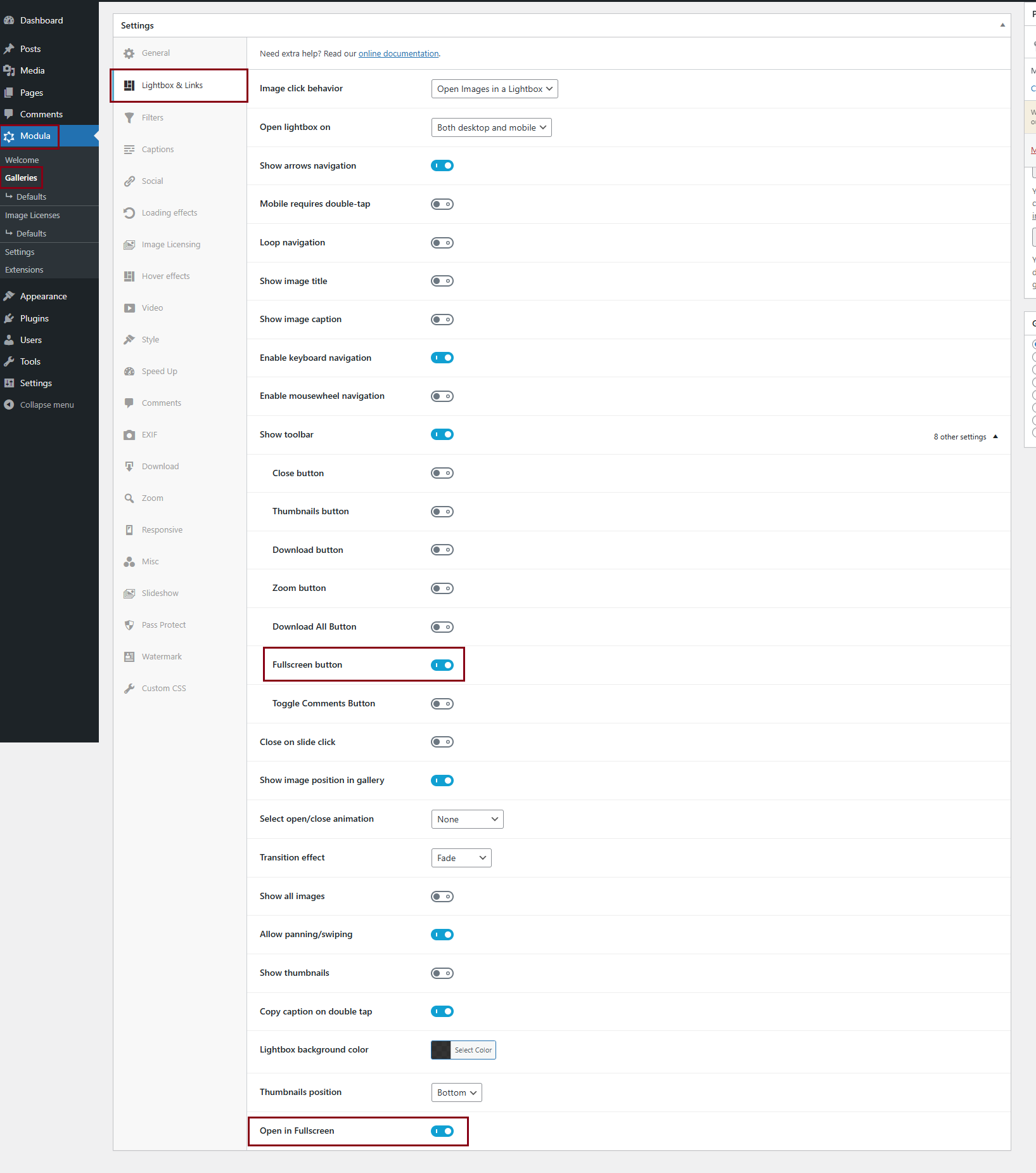 - Open in Fullscreen: Enables Lightbox opening in fullscreen mode.
