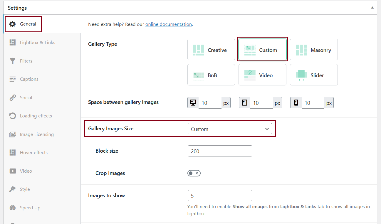 Choose Gallery Images Size Setting Based on Gallery Type