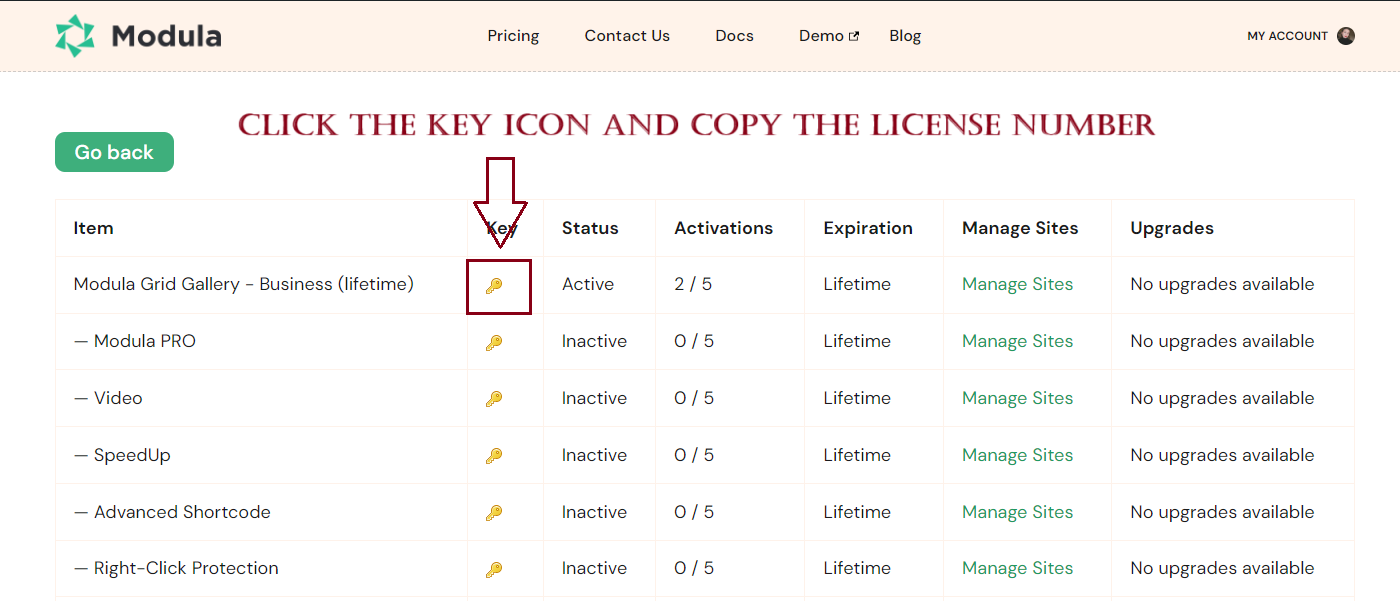 To activate your license key copy it from the purchase confirmation email or your Modula account. Log in here> go to Purchase History and then click on View Licenses.