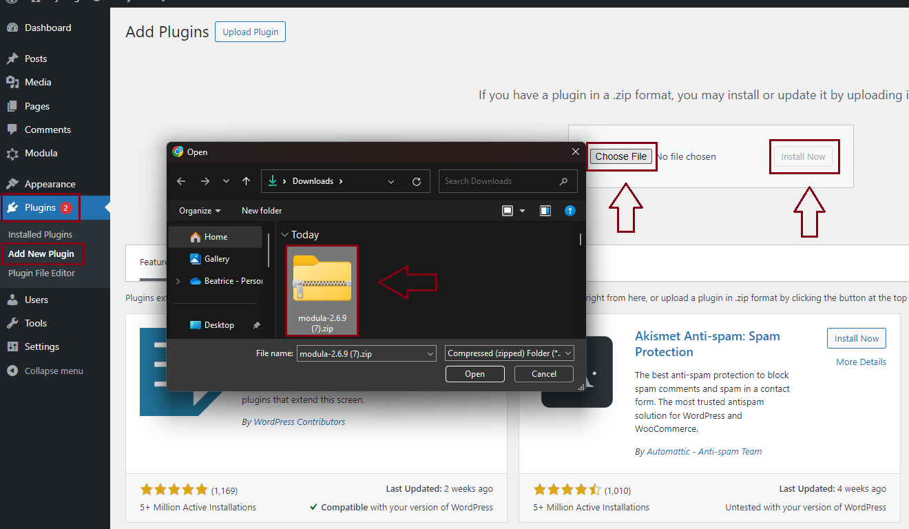 After you download the zip files go to your website’s admin dashboard > Plugins > add new > select the zip file > install and activate the plugin. Make sure to also have the Lite version installed. If you do not have it you can go to Plugins > add new > search for Modula > install and activate it.