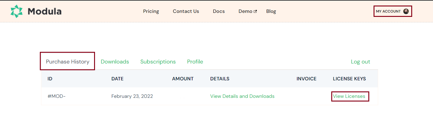 To manually renew your subscription(s), go to your Modula account, log in, and go to Purchase History > View licenses.
