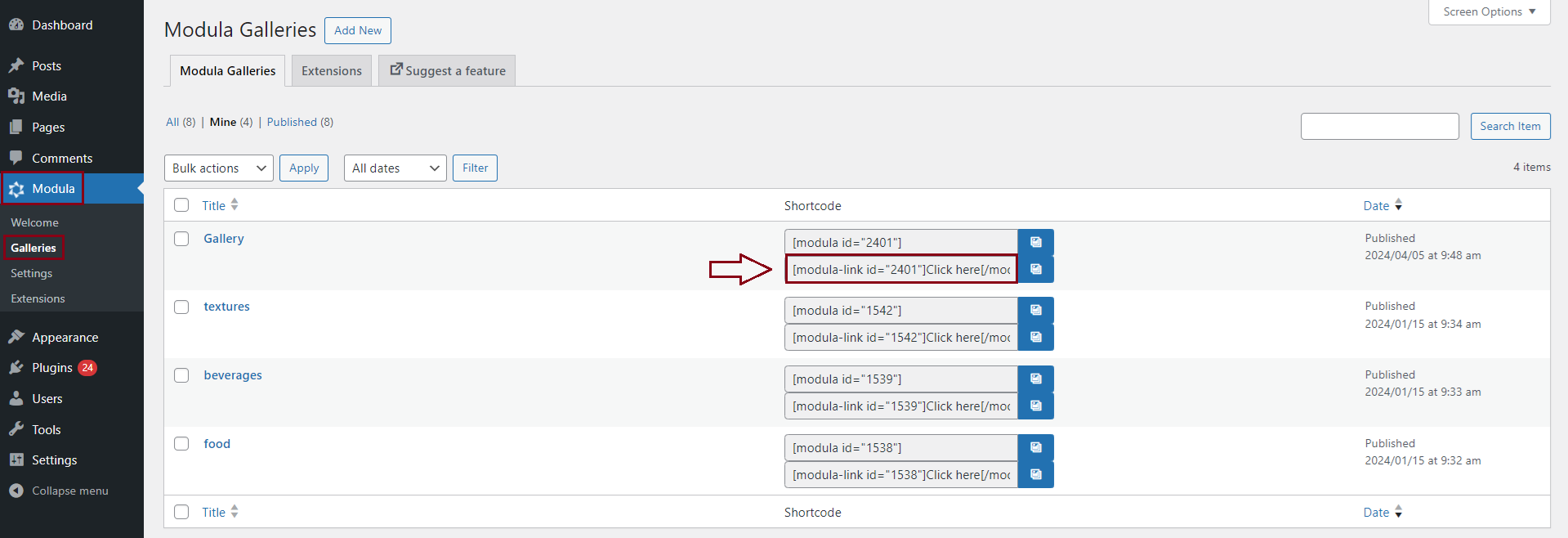Go to your dashboard > Modula > Galleries > and copy the link shortcode.