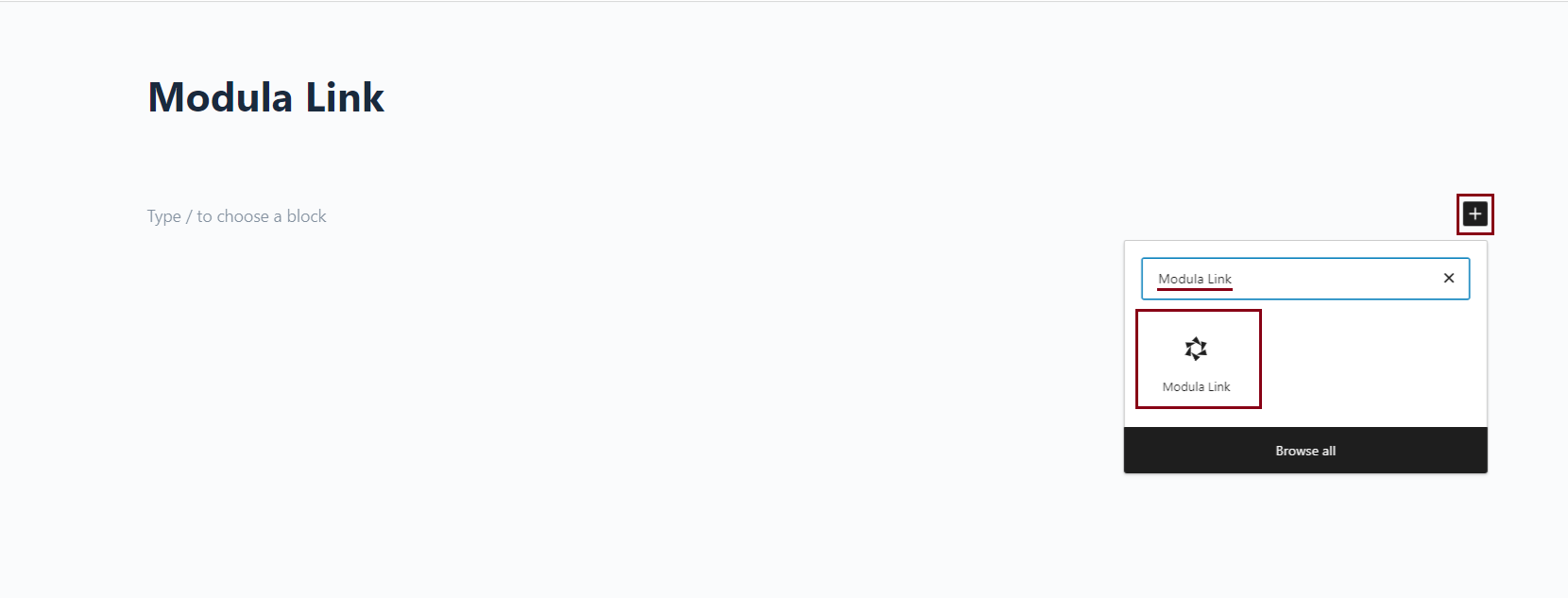 Go to your dashboard > edit the page where you want to add it to > and click on the ‘+’ sign to add a block > search for Modula Link > and select your gallery.