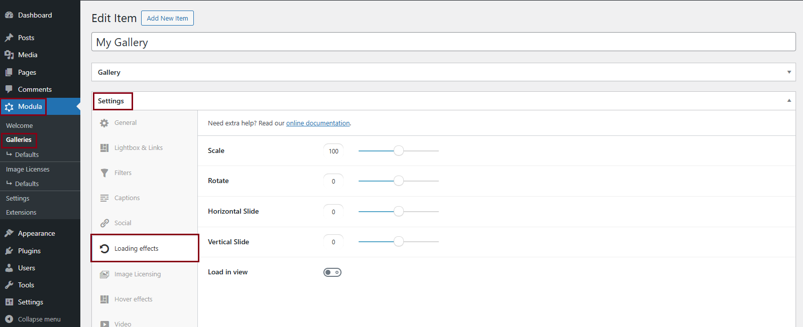 Within the gallery settings, navigate to the “Loading Effects” tab under Settings.