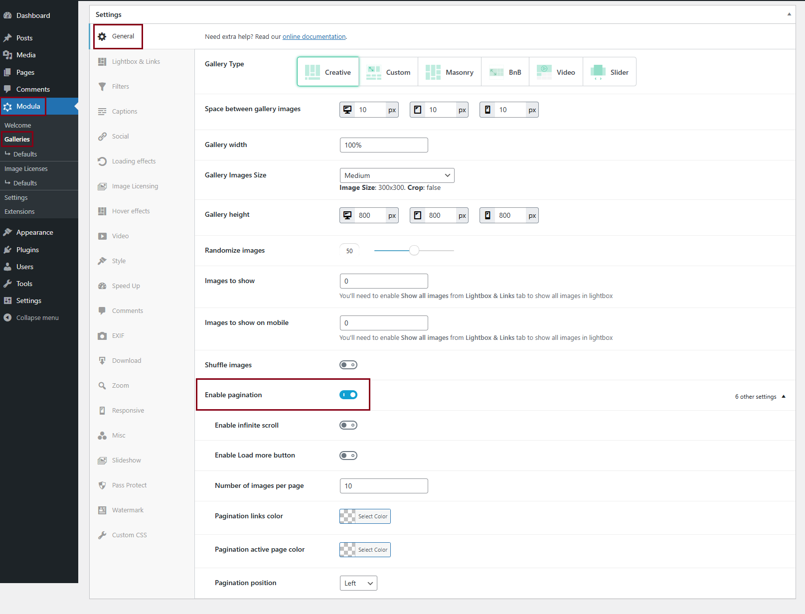 Once it’s enabled you will see a bunch of new options. To see a demo with Modula Pagination please click here.